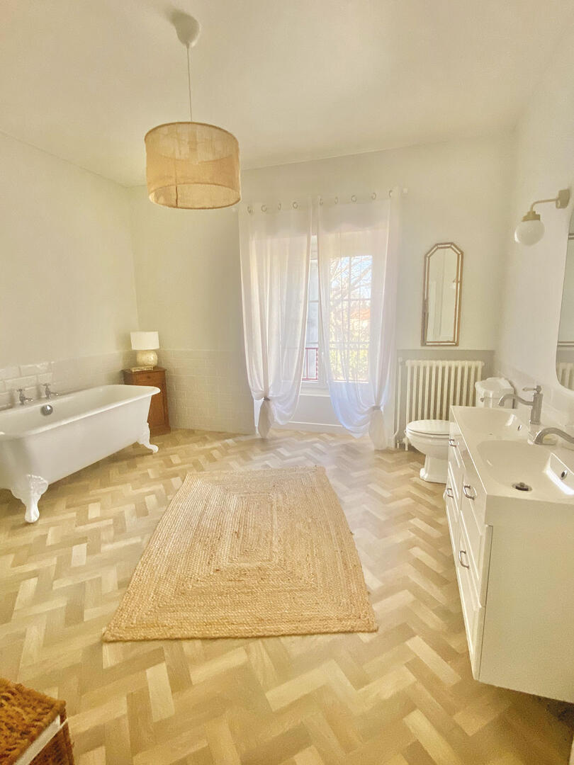 Salle de bains parentale. Un linoleum imitation bois permet l’utilisationsans complexe de la baignoire (d’origine) à pattes de lion, de retour dans la salle de bains après sablage et thermolaquage en usine. Meubles de salle de bains Ikea
