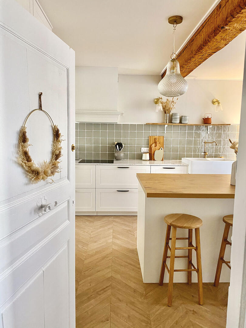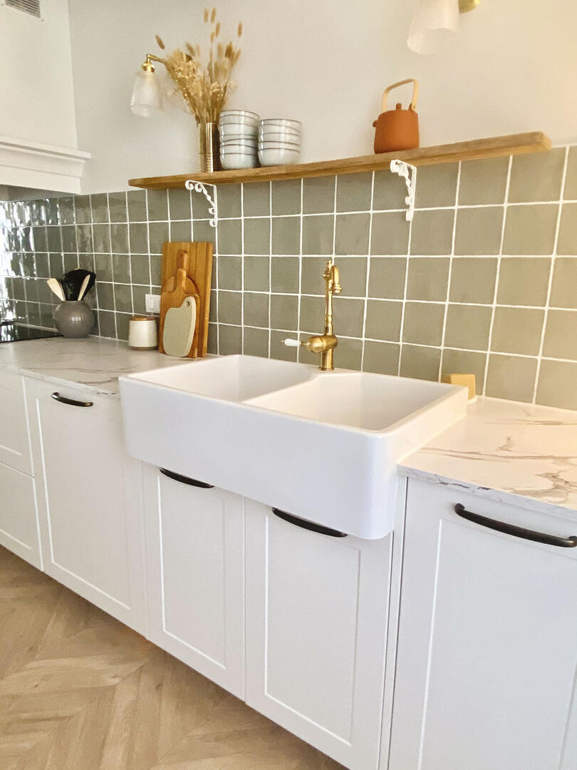 En cuisine. Cuisine réalisée par In Concept (Castres). Faïence zellige vert de gris. Plan de travail en stratifié effet marbre. Évier timbre d’office en céramique double vasque avec mitigeur doré.