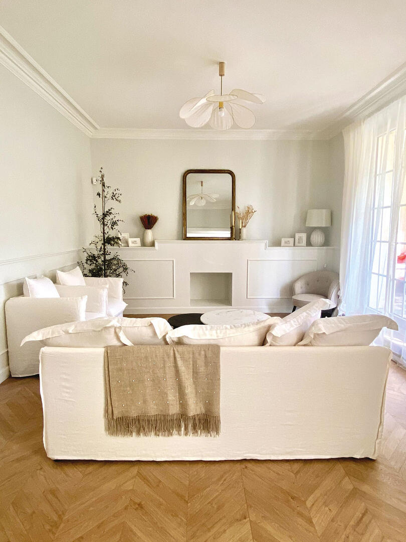 Esprit scandinave. Canapé Maisons du Monde (Albi et Castres) et luminaires La Redoute. Plafonds blanc mat et murs gris clair de Guittet. Aux murs, des cimaises sont apposées pour donner du relief et casser la hauteur.