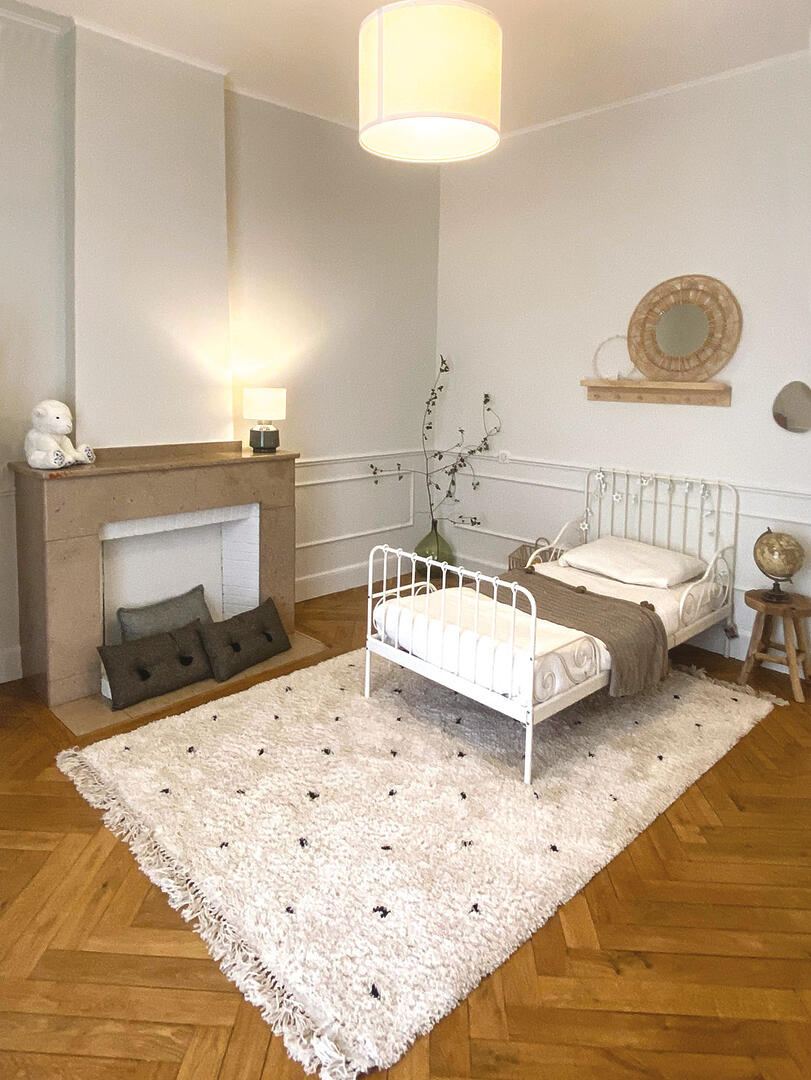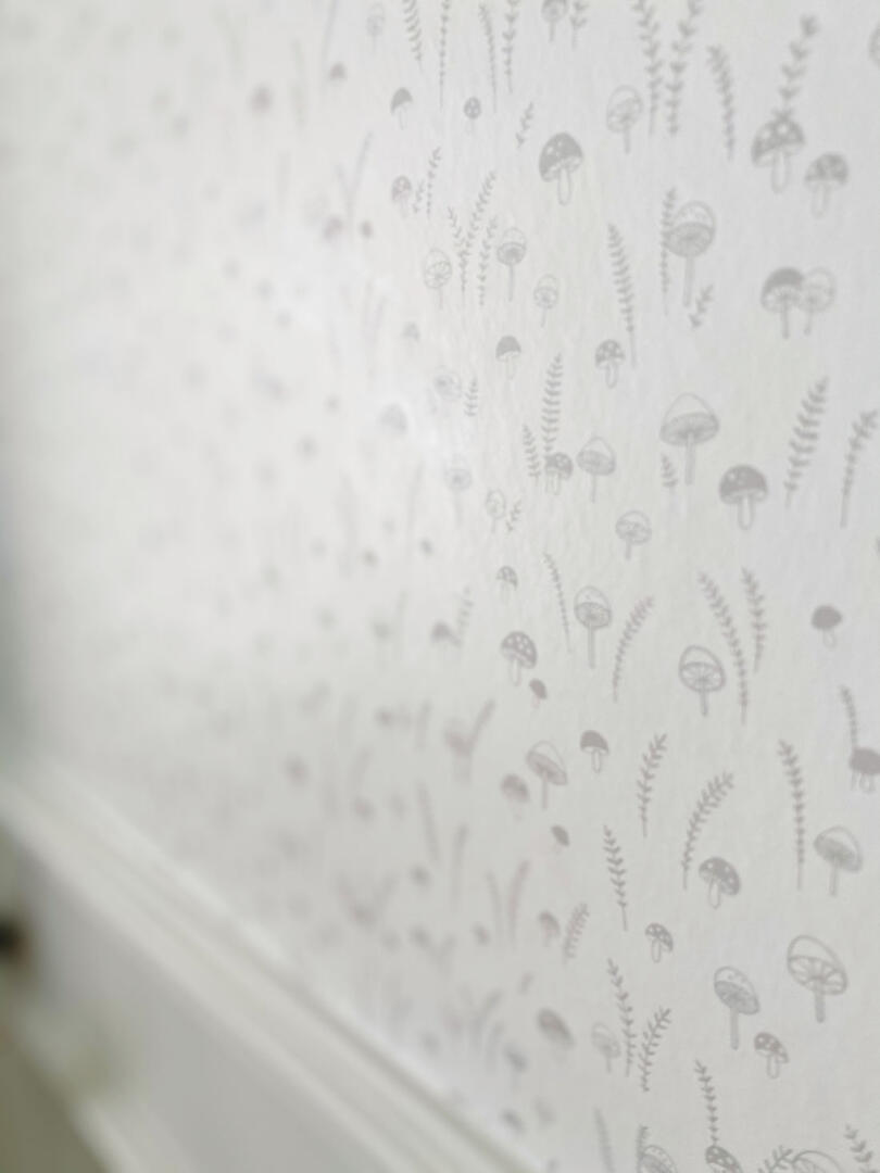 Chambre d’enfant. Papier peint My Little World champignon gris. Mobilier IKEA.