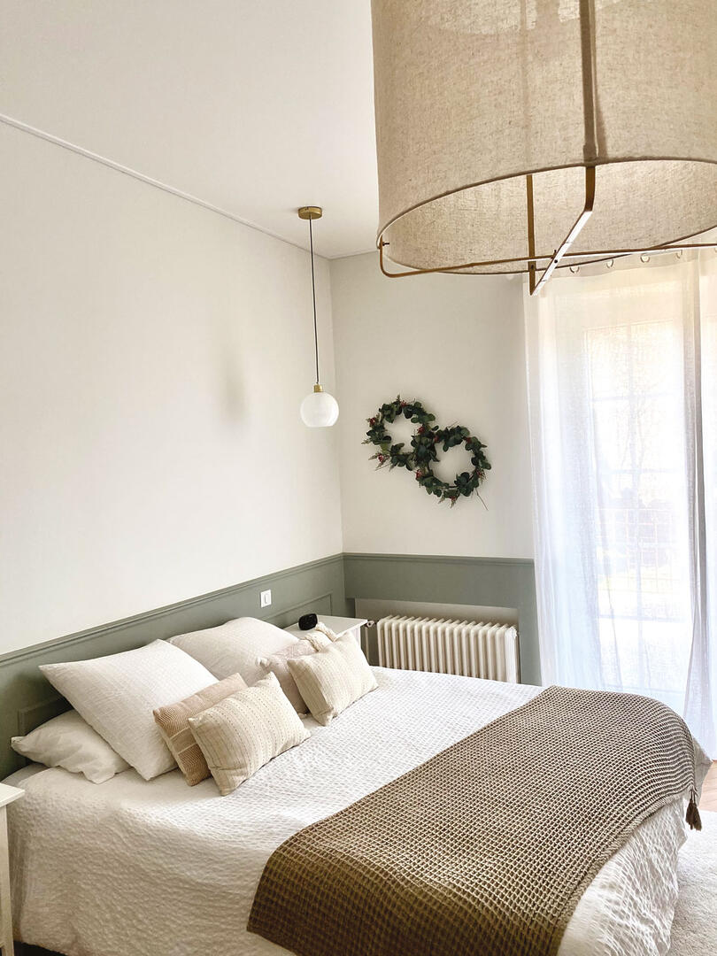 Chambre parentale. Suspension Alinéa, linge de lit La Redoute. La cimaise sert de tête de lit..