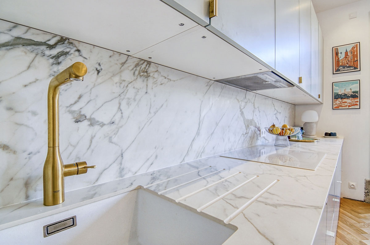 Une crédence effet marbre taillée sur-mesure de chez Décocéram (Portet-sur-Garonne et Saint-Alban) et la robinetterie en laiton apportent une touche luxueuse à la cuisine.