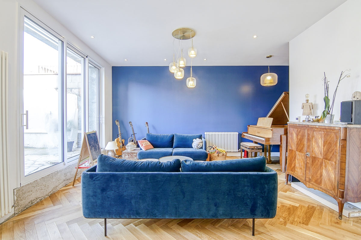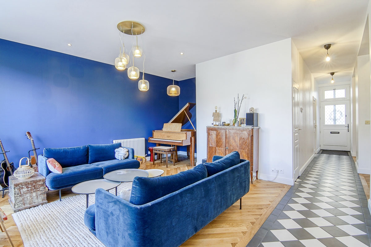 Second salon. Le couloir au carrelage en damier mène à un second salon coloré. Un piano « Pleyel » datant de 1943 et un duo de guitares sèches font résonner une touche musicale. Collection de suspensions de la série Minstinguett et canapés bleus se fondant parfaitement dans l’ambiance proviennent de l’enseigne AMPM.