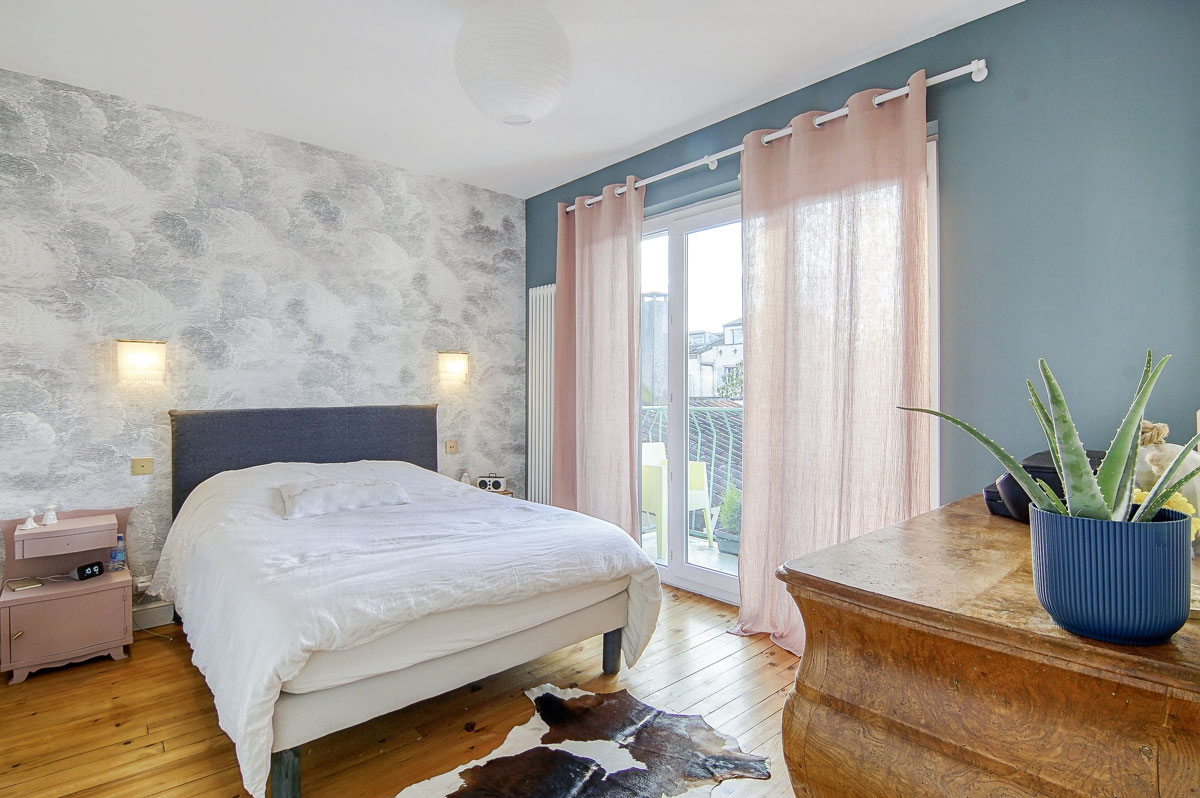 La suite parentale bénéficie d’un papier peint « Nuage » de l’éditeur tarnais Labo Léonard et de murs couleur « light blue » de chez Farrow & Ball pour une atmosphère légère et agréable. Un climat rustique se dégage de la commode et du parquet en chêne massif.