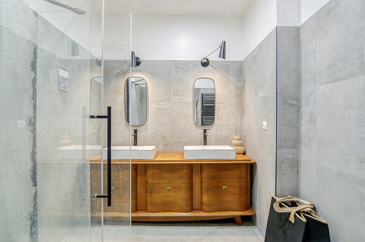 La salle de bains parentale est la touche industrielle du logement avec des carreaux 60x60cm « Urban » effet béton ciré de chez Décocéram (Portet-sur-Garonne et Saint-Alban). Les appliques murales Made mettent en lumière les miroirs Maisons du Monde (Portet-sur-Garonne, Labège et Blagnac) et les vasques Amsterdam en céramique blanche de NV Gallery.