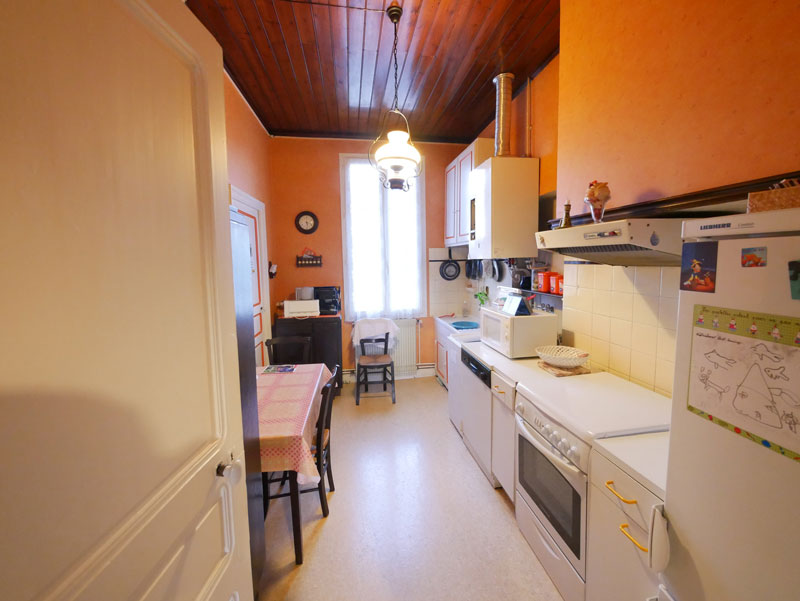 La cuisine blanche et vert amandier grisé est un mix de deux enseignes : IKEA et Plum Kitchen. Un parquet en chêne à bâtons rompus est une nouvelle fois présent, éclairé par un lustre à pampilles. Accordée à la crédence, une plaque effet marbre a été apposée sur la table en bois de famille pour lui offrir une seconde vie.