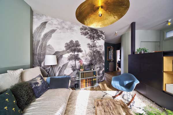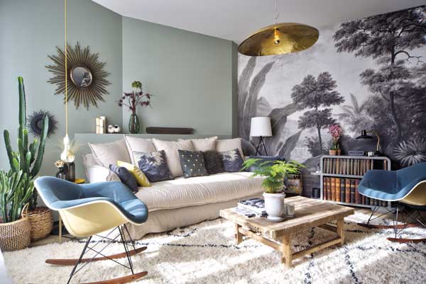 Salon TV. Aux murs : peinture gris bleu frais (Blue Gray de Farrow & Ball) et papier peint panoramique Ananbô (modèle Bengale grisaille). Côté mobilier : fauteuils à bascule sur patins en bois Eames RAR chinés, parmi les créations les plus célèbres de Charles et Ray Eames (1950). Canapé Marie’s Corner Weldon-C. Suspension Brass 95 en laiton martelé de Gervasoni, design Paola Navone. Tapis artisanal berbère. Miroir soleil AM.PM Ø80 cm en laiton.