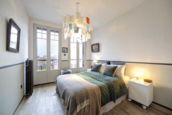 Chambre avec balcon. Identité sobre et élégante pour cette chambre d’amis. La cimaise couleur Obsidian Green sépare la partie basse du mur Slaked Lime dark et la partie haute Slaked Lime mid (Little Greene). Suspension Zettel’z d’Ingo Maurer (1997). Chevet Ikea.