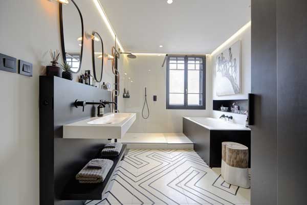 Salle de bains. Le carrelage de la salle de bains, les équipements sanitaires, la vasque des WC proviennent de chez Gomez Carrelages et Bains (Toulouse et Labège). Toile du peintre basque Jon Mao. Tabouret acheté chez L’Interprète (Toulouse). Le sèche-serviette en cuivre cintré est une création originale du plombier Denis Dastugue d’Adecotherm (Toulouse).