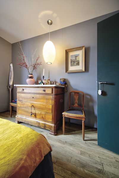 Mélange des styles. Au-dessus de la commode ancienne, suspension Cigar George Nelson de chez Bensimon Home. Modèle conçu en 1952 par le designer George Nelson.