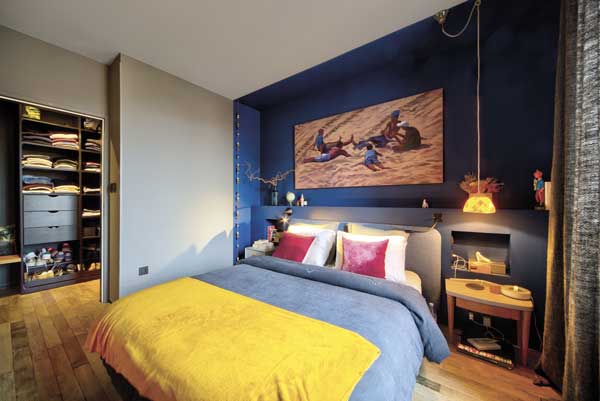 Chambre avec dressing. Tête de lit en Royal Navy (Little Greene) et murs en Urbane Grey (Little Greene). Au-dessus du lit, œuvre du peintre basque Jon Mao.