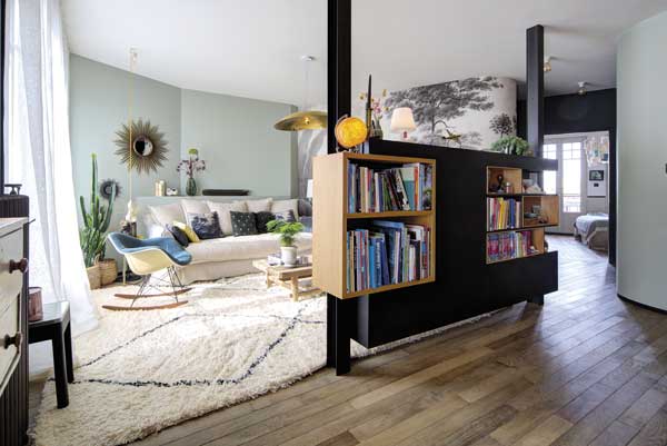 Distribution. Lorsque l’on entre dans la pièce à vivre du plateau bas on trouve à droite le salon TV, à gauche l’espace bureau et au fond le coin lecture.