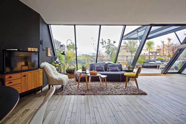 Salon sur le toit. Tapis Toulemonde Bochart. Canapé Bend-Sofa designé par Patricia Urquiola pour B&B Italia (2010). Tables basses chinées, applique copie Serge Mouille.