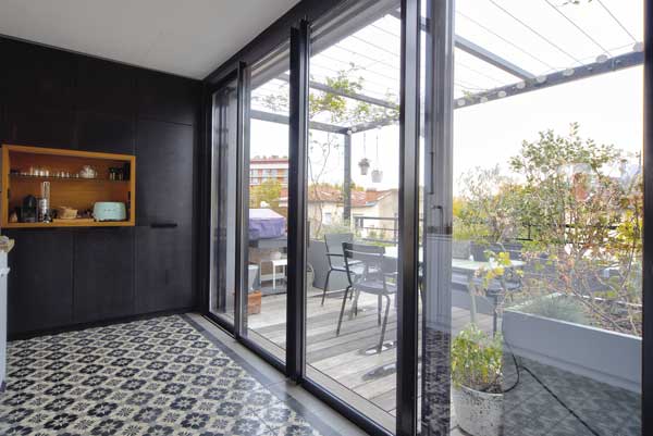 Verrière inclinée signée Atelier Benoit Hérouard (Toulouse). « Il a fallu inventer l’ouverture spécifique à cette verrière, garantissant l’étanchéité à l’eau et à l’air, pour pouvoir sortir vers la terrasse végétalisée, explique l’architecte. Cette porte basculante est devenue possible grâce au savoir-faire et l’ingéniosité de l’Atelier Benoit Hérouard. »