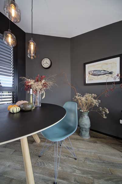 À table. Suspensions Amp Lamp de Normann Copenhagen. Table Copenhage CPH20 conçue par les Frères Bouroullec pour Hay. Chaise Eames de Vitra conçue par Charles & Ray Eames en 1950. Aux fenêtres, brise-soleil Griesser.