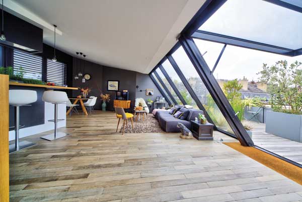 « Pour la surélévation nous avons imaginé une verrière inclinée, faisant partie à la fois du volume de toiture et de la façade. » Créé de toute pièce, le plateau haut de 40 m² accueille un séjour-cuisine ouvert et baigné de lumière naturelle : au nord, par la verrière inclinée qui donne sur une terrasse « détente » avec un vrai jardin paysager ; au sud, par des baies vitrées qui ouvrent sur une terrasse où une pergola végétalisée abrite le coin repas.