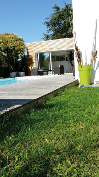 L’extension de 35 m² habitables, dessinée par les architectes, consiste en un volume horizontal, collé à l’existant, placé entre la piscine et la rue. La pente de toit est volontairement faible pour ne pas priver la piscine du soleil du soir. Les architectes vont coordonner les artisans : maçon, charpentier (Gaspin), menuisier alu, plaquiste et électricien.