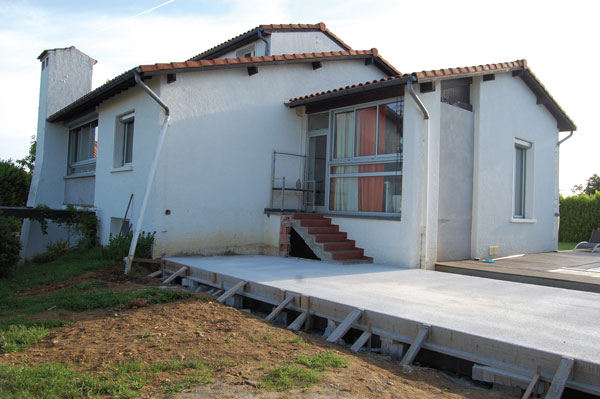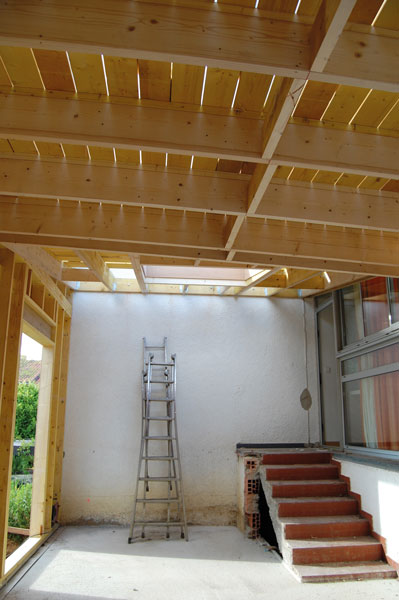Pour son projet d’extension, le couple refait appel à CD architectes et demande à travailler avec les charpentes Gaspin. Basée à Cugnaux, cette entreprise de charpente, couverture et ossature bois, a été créée en 1977 par Jean-Louis Gaspin. C’est aujourd’hui son fils Sébastien qui la dirige. Elle construit chaque année quelque 5 maisons et 6 à 8 extensions et surélévations en ossature bois. « L’ossature bois c’est très bien, indique Olivier Delori. Le chantier est propre et rapide. La structure plus légère qu’une structure béton pèse moins sur les fondations. » Sébastien Gaspin ajoute : « Par rapport au béton, l’ossature bois permet un gain de surface habitable, car les murs ont besoin d’être moins épais, à performances thermiques identiques ».