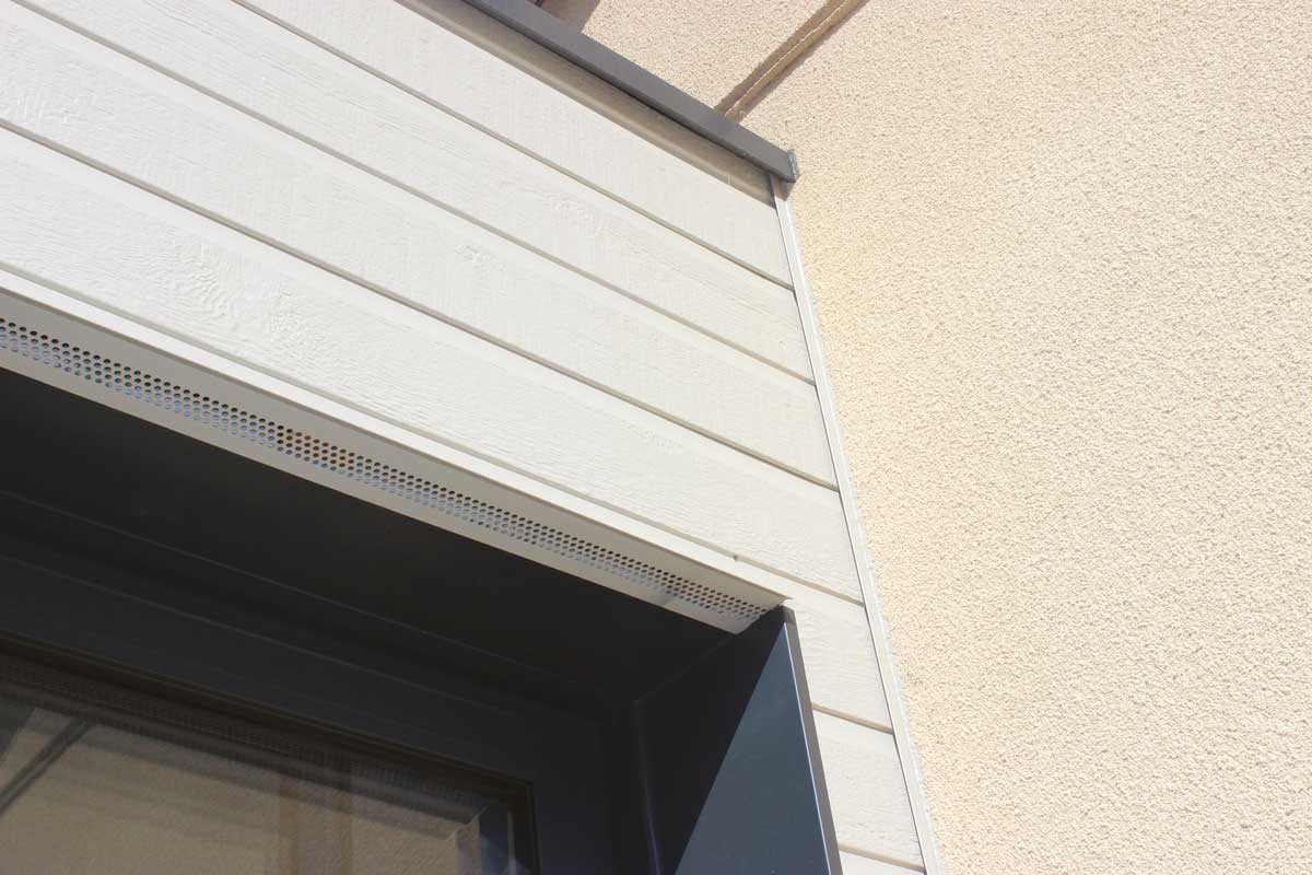L’extension est bardée de Canexel, couleur River Rock, de profil Ridgewood. Ce bardage en bois composite ne grise pas et ne requiert aucun entretien.