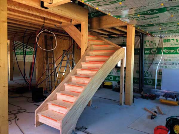 7. Pose de l’escalier en bois lamellé-collé.