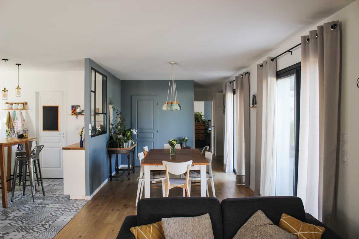 Dans le séjour, parquet contrecollé en chêne. Entre la cuisine et la salle à manger aux murs bleu gris, la verrière affirme le style contemporain de la cuisine. Conception : Fer & Tendance (La Salvetat-Saint-Gilles). « Ils ont été de très bons conseils, rapides et dans les prix », affirme Cédric, très satisfait de sa verrière sur-mesure.