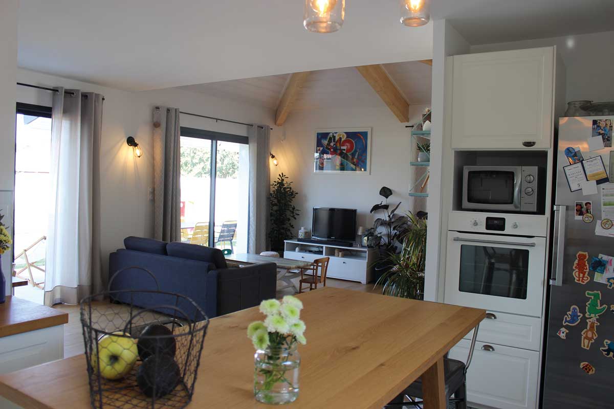 Le plan de la maison bouclé, le permis accordé, le couple coordonne les artisans et organise le chantier. Les travaux démarrent en janvier 2017 avec les fondations. Pendant ce temps, la structure en bois est taillée dans l’atelier du charpentier Sébastien Gaspin. En mars elle est livrée pré assemblée puis montée sur le hourdis en béton isolé. Trois semaines plus tard, la maison est couverte. Ensuite les différents corps de métiers s’affairent. La petite famille aménage en septembre 2017. Conforme à la réglementation thermique 2012, l’habitation consomme peu d’énergie. Ses murs sont isolés de 145 mm de laine de verre auxquels s’ajoutent 60 mm de fibre de bois par l’extérieur. Dans les combles perdus : 380 mm de ouate de cellulose. Dans le rampant au-dessus du salon : 320 mm de laine de verre en couches croisées. Les menuiseries sont en aluminium et à double vitrage. Le rez-de-chaussée est chauffé par un poêle à granulés de bois. À l’étage : des radiateurs électriques d’appoint suffisent. Dans le bureau : une climatisation. L’eau chaude est fournie par un cumulus thermodynamique. Le renouvellement de l’air est assuré par une VMC simple flux.
