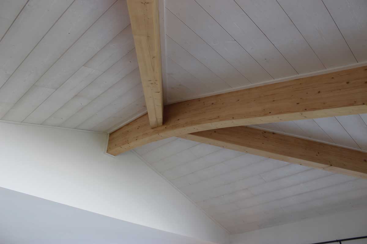 Dans le salon à charpente apparente, la hauteur monte à 3,15 m. Le lambris en épicéa blanc cérusé (Sivalbp) donne encore plus de lumière à la pièce.