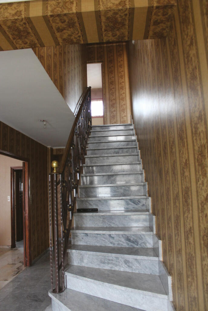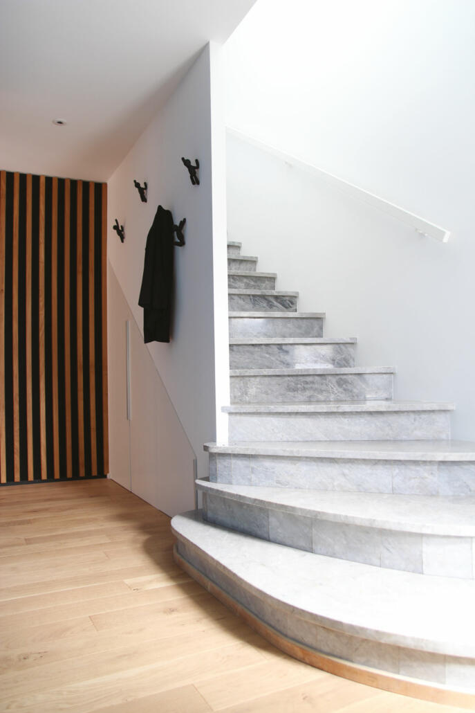 Très ample et accueillant, l’escalier en marbre est majestueux. Les murs blancs du sol au plafond du second étage, ainsi que le vitrage cadencé sur la double hauteur, accentuent l’impression de verticalité. La cage d’escalier est baignée de lumière.