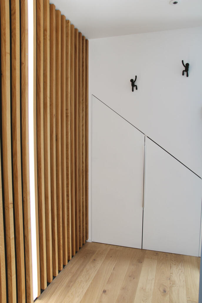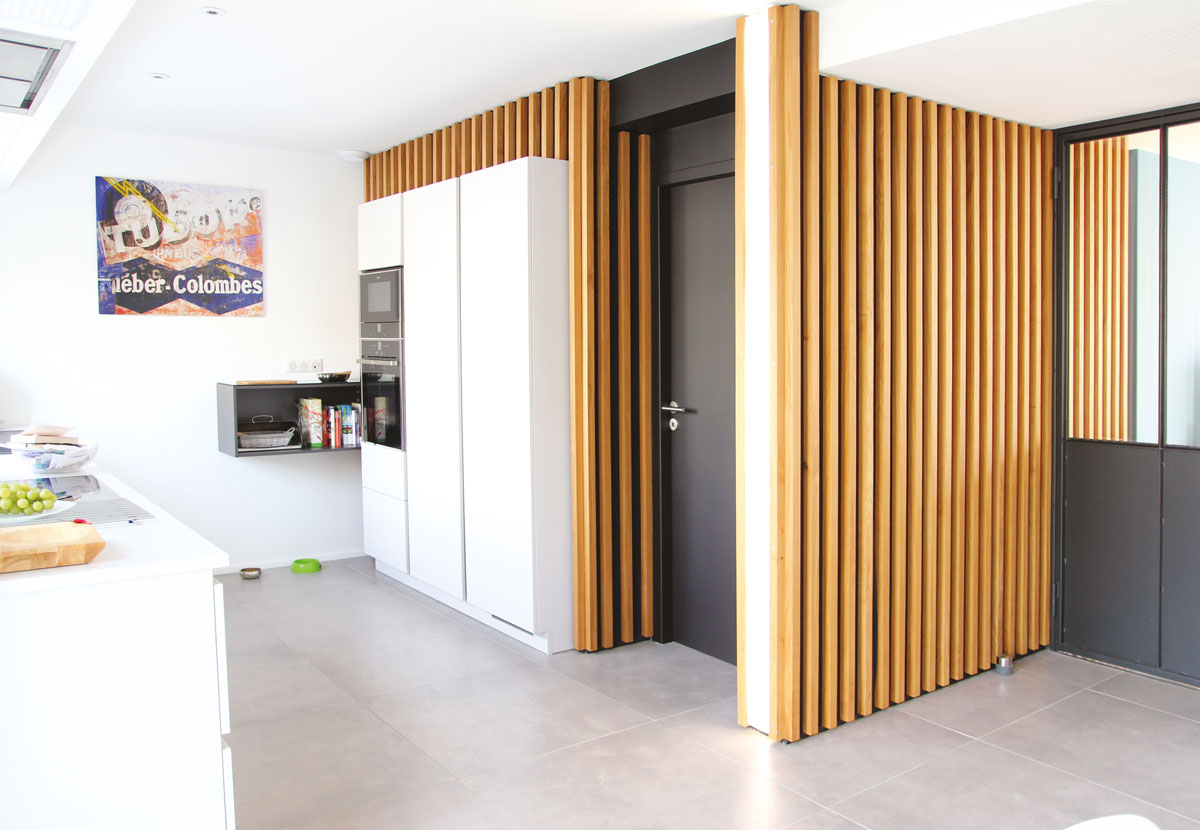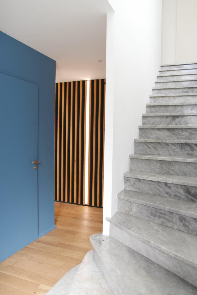 Le volume bleu orage (un wc et un placard) sépare l’entrée du salon. Le volume bardé de tasseaux de chêne (le cellier buanderie) sépare l’entrée de la cuisine/salle à manger. Le seuil virtuel entre l’entrée et le salon est marqué par un ruban de Leds derrière un plexi. Il est reproduit côté cuisine.