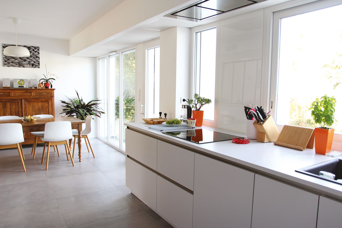 Façades pures, pures façades. Pour ne pas entacher les façades sur rue et sur jardin, hors de question de placer les caissons de volets roulants à l’extérieur. Ils sont inclus dans les retombées de plafonds à l’intérieur, qui comprennent les gaines pour la ventilation et la hotte.