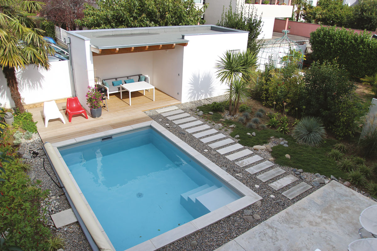 Terrasse et circulations en béton brut. Au fond du jardin, la terrasse d’été couverte et le local technique sont plein sud. De la piscine, de dimensions 5 x 3,40 m au liner gris, on a un point de vue différent sur la maison.