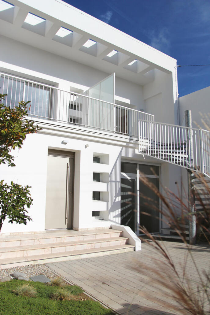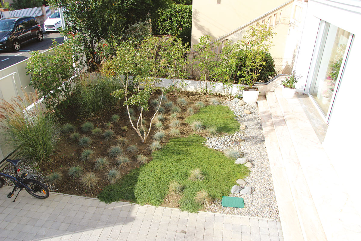 Jardin côté rue. Les baies vitrées blanches du salon, en aluminium à double vitrage Schüco (entreprise APF, Labastide-Saint-Sernin), donnent sur le jardin côté rue. Elles sont composées d’un grand fixe et d’un grand coulissant déporté.