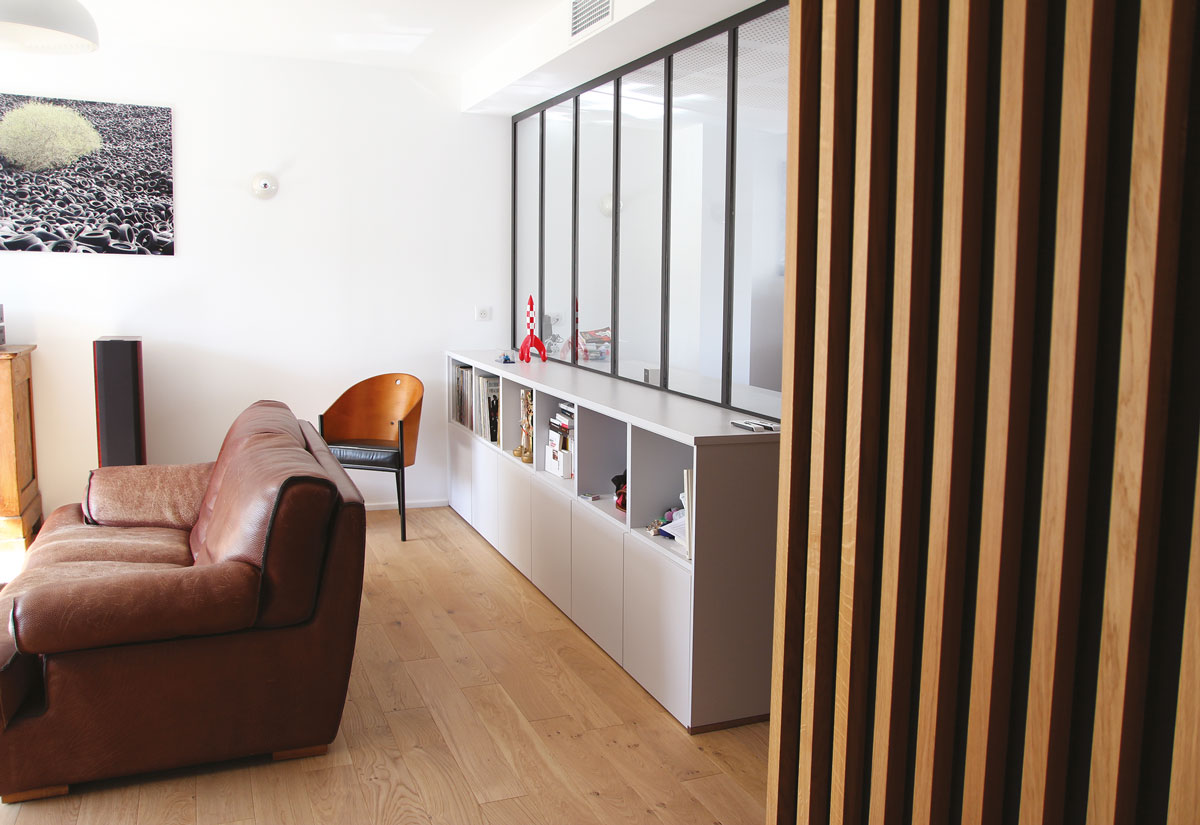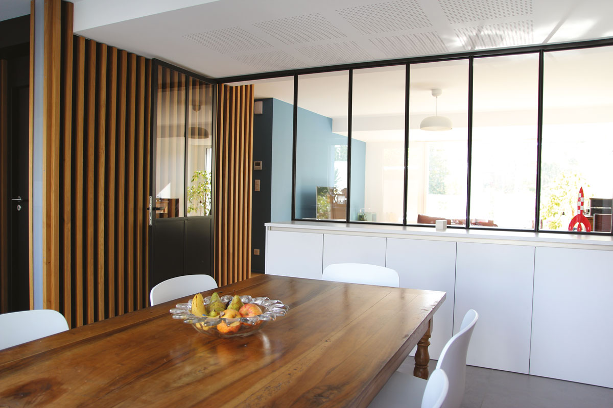 Entre le salon et la salle à manger, le ferronnier Jean-Luc Naud a créé une verrière. Dessous, les caissons créent du rangement côté salon et côté salle à manger. Ils ont été fournis par le cuisiniste CF conception (Couffouleux) pour s’harmoniser avec le mobilier de la nouvelle cuisine.