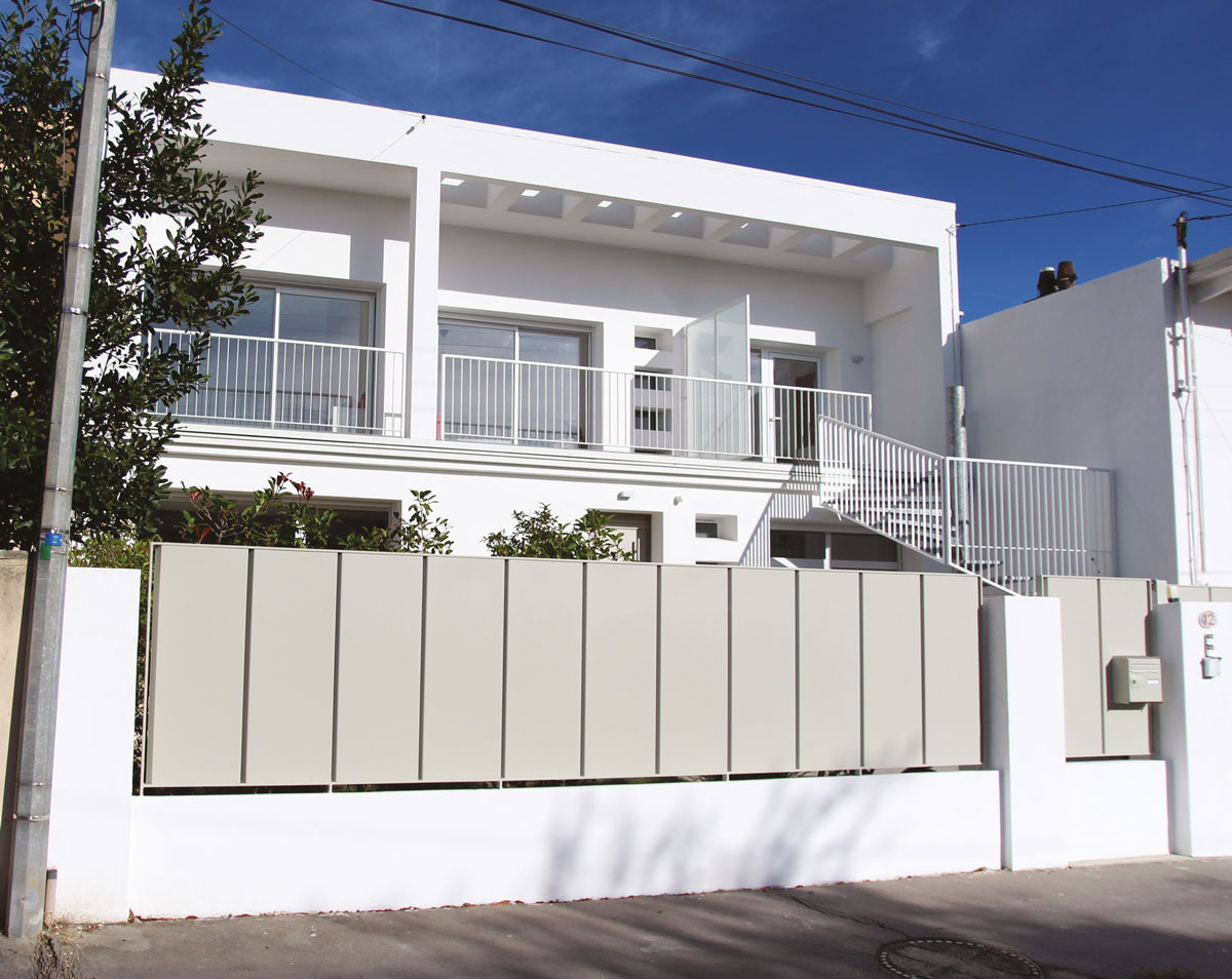 La maison après travaux. Côté rue, la ferronnerie d’origine rouillée a été remplacée par de l’acier en tôle pliée thermolaquée gris clair légèrement mastic.