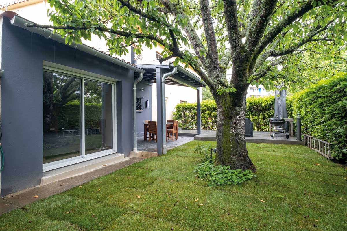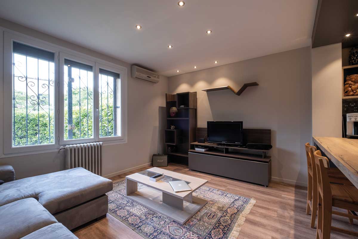 Les deux enfants de Benjamin disposent de l’étage : une chambre chacun, une salle de douche rénovée, une salle de jeux et un WC (créé). Pendant le chantier, qui a démarré en septembre 2018 pour s’achever en février 2019, la petite famille a dû déménager. Et pour cause ! Le mur porteur entre la cuisine et le salon a été tombé (une poutre métallique IPN le remplace). La fenêtre de la cuisine est transformée en porte-fenêtre. Le garage – future suite parentale – est remodelé, sa toiture en fibrociment remplacée, son toit et son sol surélévés. Son accès depuis l’escalier est percé. L’escalier en granito est admirablement transformé. Dans toute la maison, la plomberie et l’électricité sont refaites à neuf. Le vieux chauffage central fait place à une chaudière à condensation flambant neuve. Des faux-plafonds sont aménagés au rez-de-chaussée pour passer les gaines et encastrer des spots leds. Murs et plafonds sont repeints, les radiateurs en fonte aussi (après décapage). Sur le toit, les tuiles et les gouttières sont remplacées, les combles sont isolés (24 cm d’épaisseur de laine de verre déroulée). Dehors, le jardin est engazonné, un appentis à structure métallique est créé, ainsi qu’une terrasse. Pour ce projet, Nathalie Patrigeon s’est appuyée sur son réseaux d’artisans dont l’entreprise Dupont agencement de Tarbes, à qui l’on doit la réalisation de tous les meubles, dessinés par l’architecte d’intérieur, ainsi que la rénovation de l’escalier.