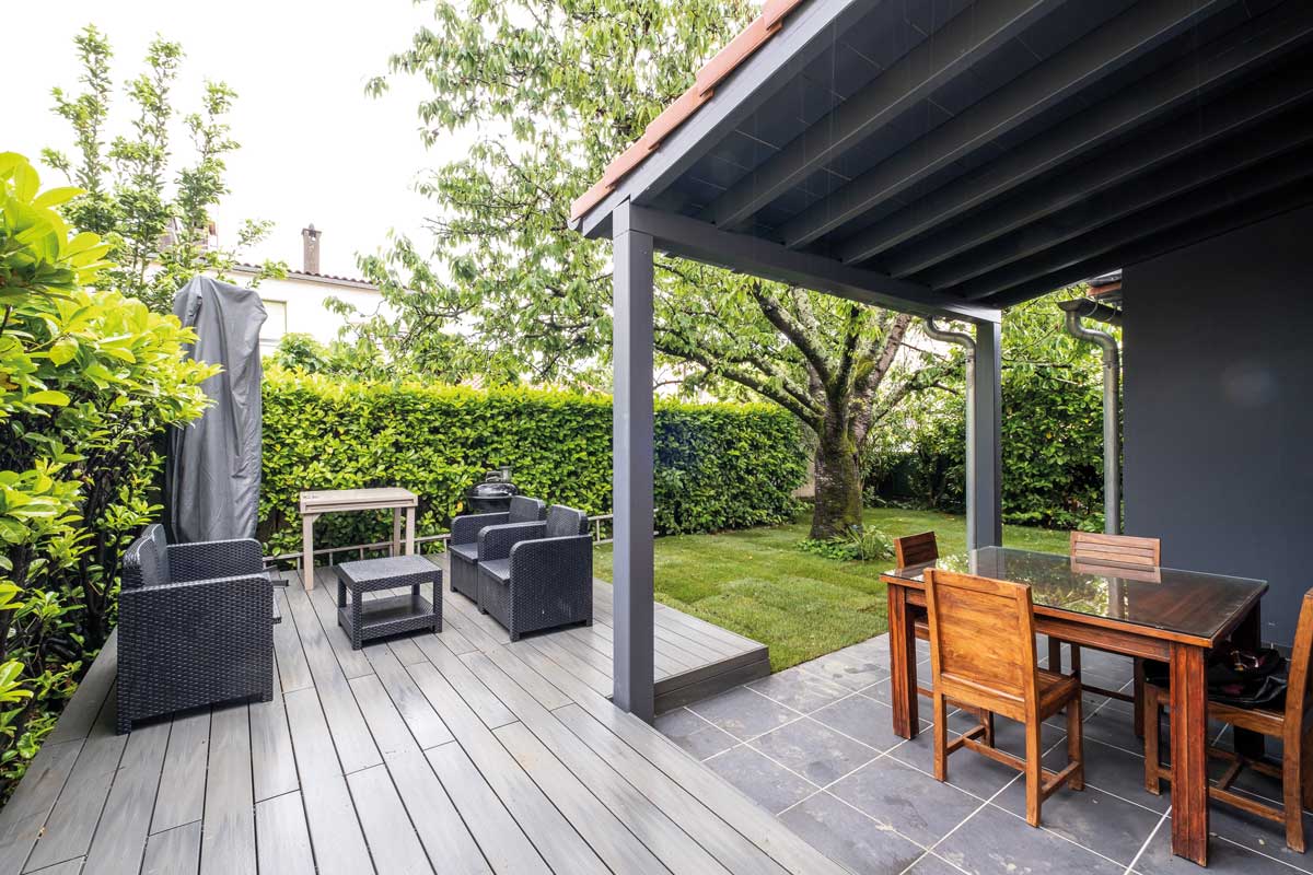 La terrasse est sur 2 niveaux : la partie haute en bois composite pour le salon de jardin,