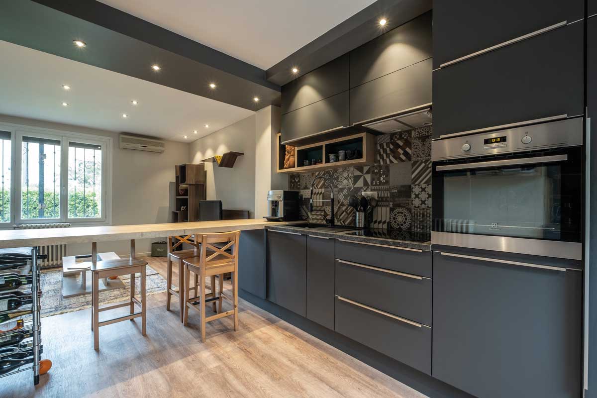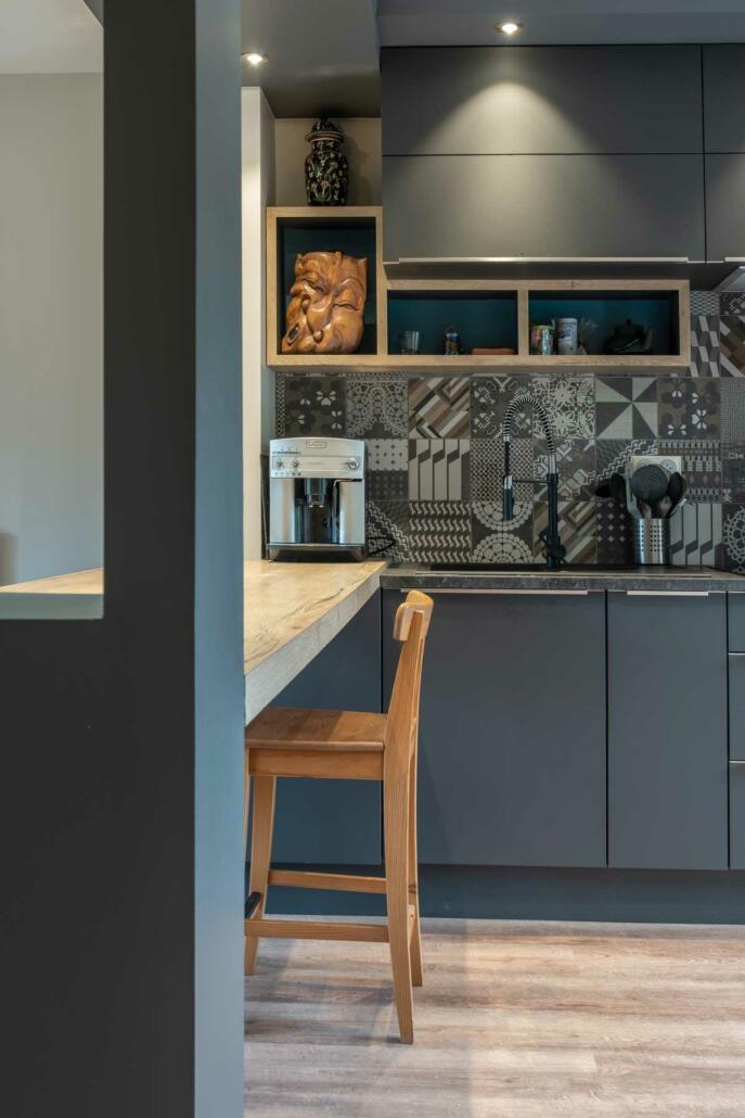 Cuisine ouverte et conviviale. La couleur gris anthracite des meubles de cuisine fait ressortir le bois de la table à dîner et des niches de rangement. Le tout est en stratifié haut de gamme et est réalisé par Dupont agencement (Tarbes) d’après les dessins de l’architecte d’intérieur Nathalie Patrigeon. Notez le soin apporté aux détails : les niches sont recouvertes de stratifié ton bois, l’intérieur de stratifié noir et le fond de stratifié bleu canard.