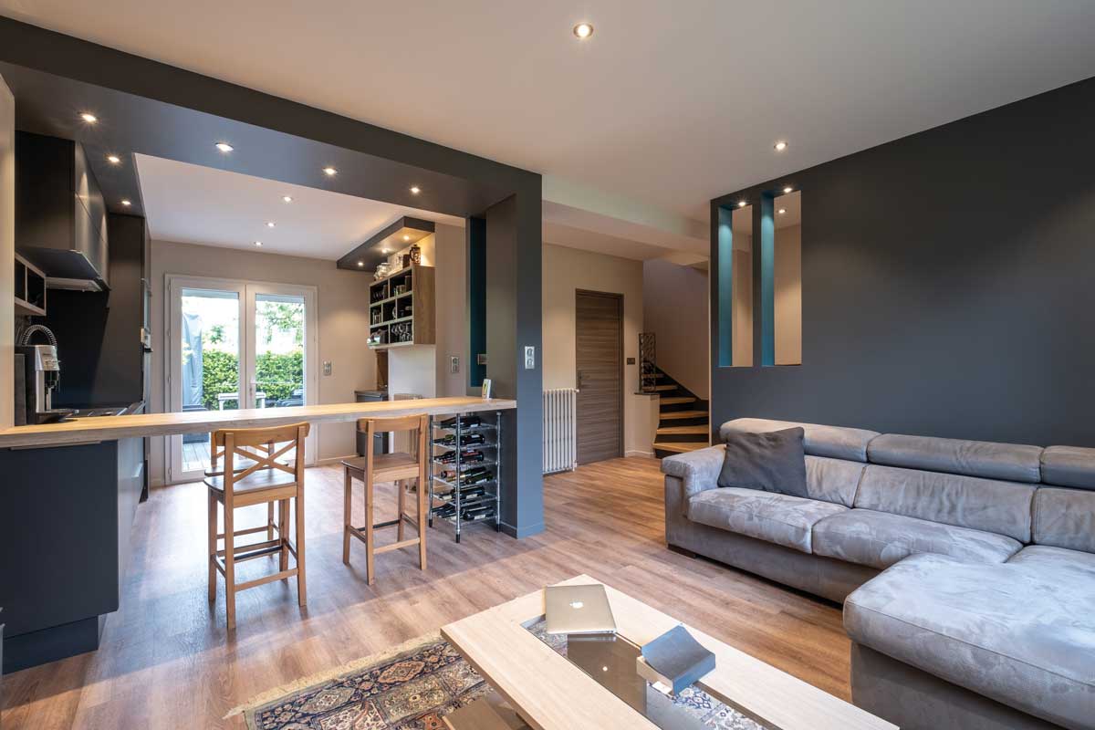 Le sol souple de la pièce à vivre est un vinyle imitation bois. Les murs sont grèges, les plafonds blancs, les coffrages de l’IPN, du poteau et des gaines sont gris anthracite, comme le mobilier de la cuisine. La porte qui donne au cellier est façon bois. L’épaisseur des niches au-dessus du canapé est peinte en bleu canard.