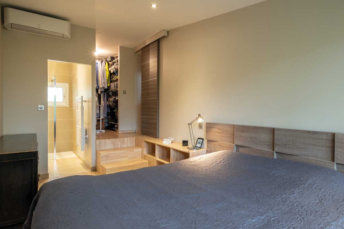 L'estrade est un aménagement en bois lamellé-collé qui met de plain-pied le dressing et l’escalier de l’étage de l’autre côté de la porte coulissante de la chambre.