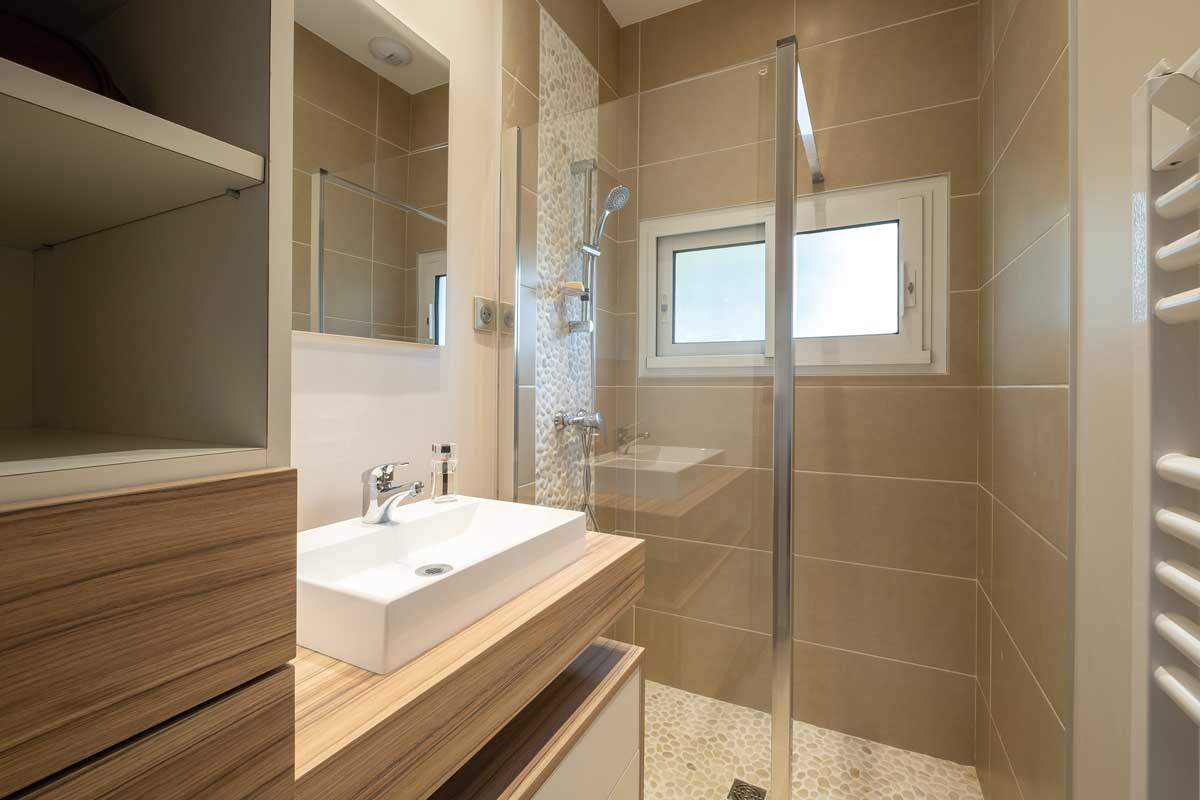 Galets au sol de la douche à l’italienne comme derrière la colonne de douche, carrelage beige de 60x30cm au mur, l’assorti au sol.