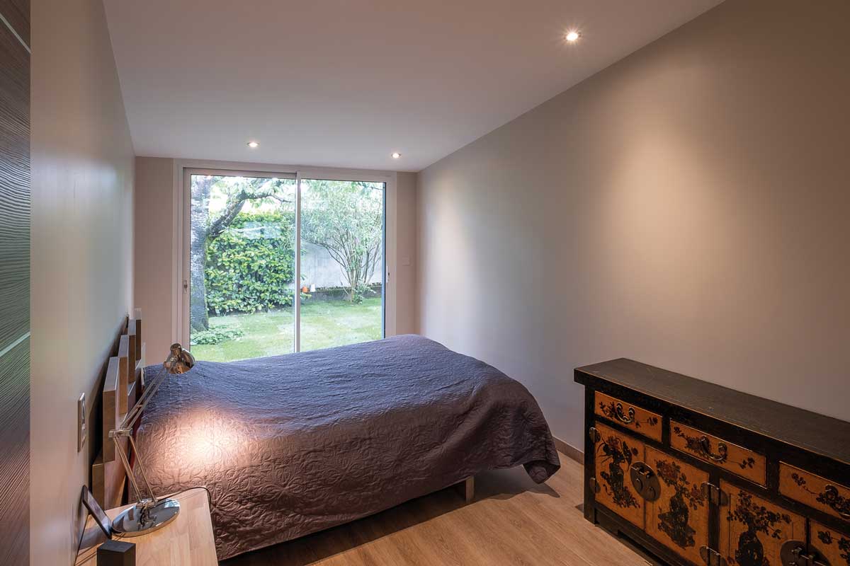 Derrière la baie vitrée se trouve la suite parentale du propriétaire, installée dans l’ancien garage complètement transformé.