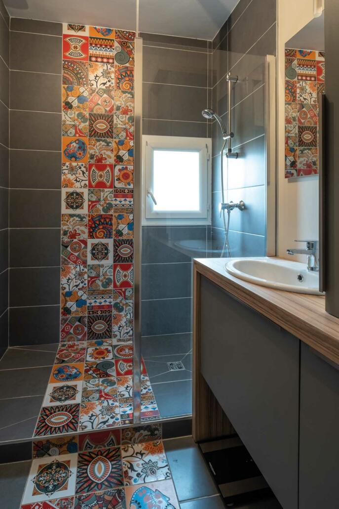 Dans la salle de bains des enfants des motifs mexicains forment un chemin de couleurs qui va de l’entrée jusqu’au plafond.