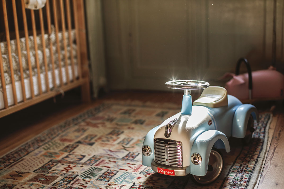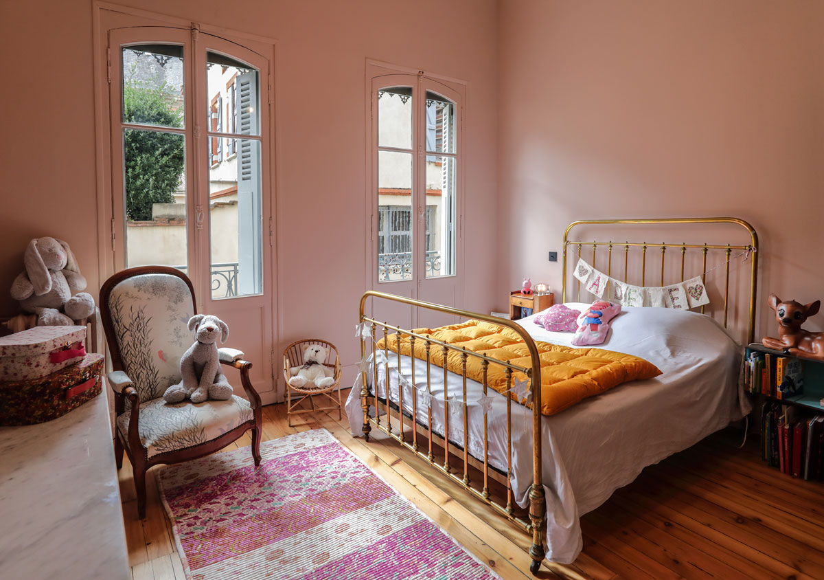 Les murs de cette chambre d’enfant de 18 m2 sont rose pastel (Setting Plaster de chez Farrow & Ball). Au sol parquet d’origine rénové.