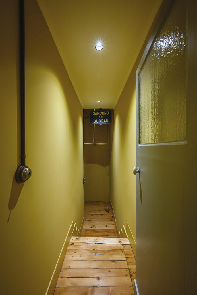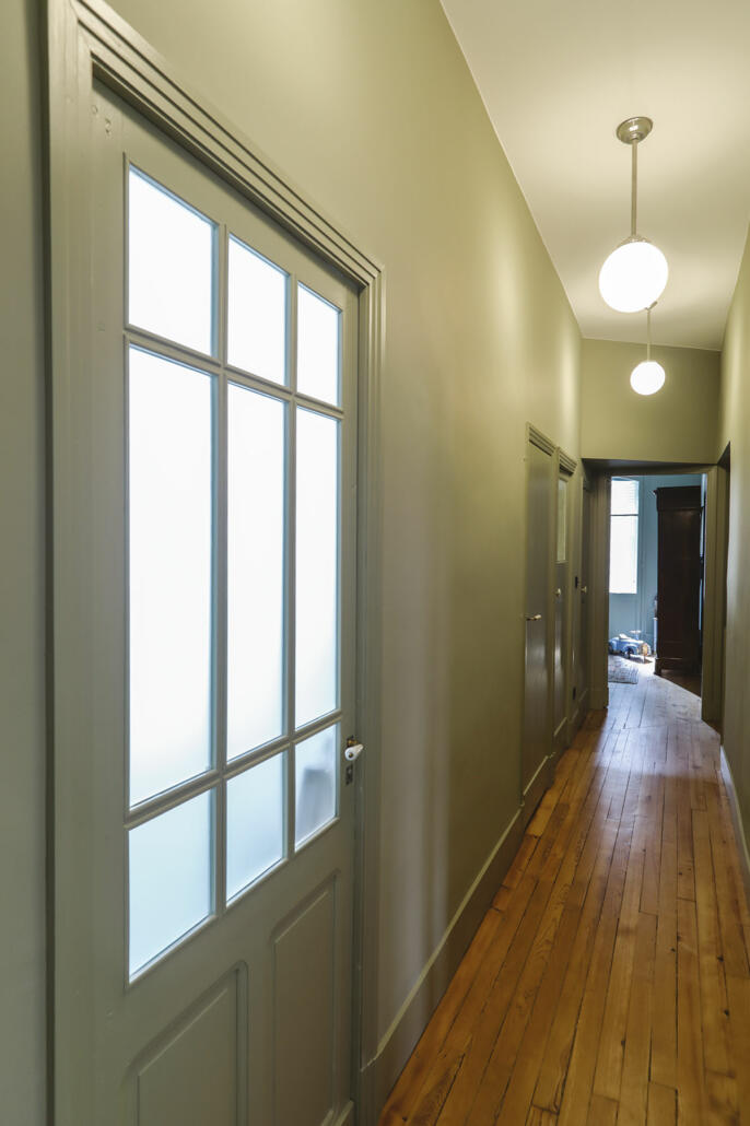 D’environ 4,50 m, la longueur du couloir est cassée par la lumière provenant de la porte vitrée de la salle de bains des enfants. Teinte gris vert apaisant aux murs du couloir (French Grey de chez Farrow & Ball).