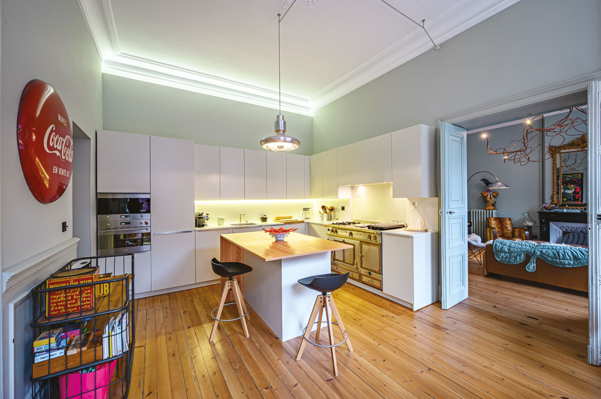 Plan de travail bien éclairé par un bandeau Leds. Rétroéclairage de la corniche. Recouvrement lumineux de l’îlot par une suspension chinée à Barcelone. Installé sur un tabouret MDF Italia (Voltex, Toulouse), on cuisine, on travaille, on discute sur l’îlot central au placage d’olivier. Aux murs, teinte très claire vert de gris de Farrow & Ball. Très fonctionnel, mobilier de l’Italien GED Cuisine aux façades de couleur plume, laque mate, avec de très discrètes poignées sur chant en inox. Plan de travail Silestone de chez Midi-Pyrénées Granits (Cugnaux). De famille, très beau piano de cuisson La Cornue.