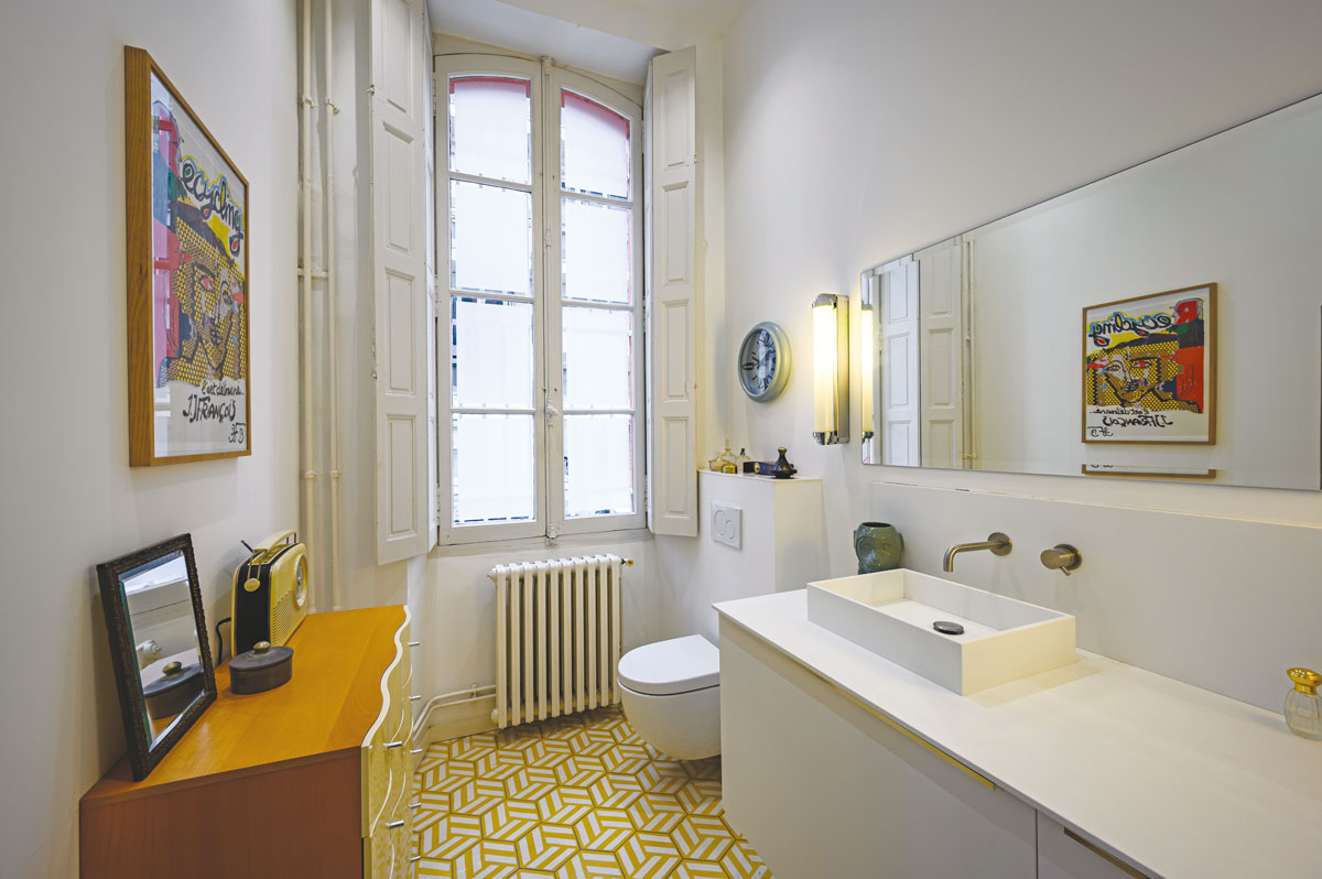 Dans la salle de bains de la suite parentale, au Corian blanc s’oppose le carreau de ciment jaune. Robinetterie encastrée Cocoon. Appliques de famille. Toute la douche est en Corian.