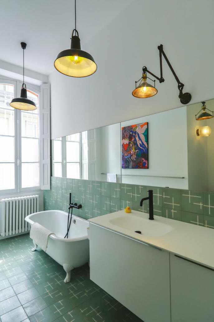 Murs et plafonds blancs, carreaux de ciment de chez Popham Design (Paris) au motif moderne de couleur vert amande. Suspension chinée sur les allées François-Verdier. Style industriel appuyé par la robinetterie noire Ondyna. Baignoire à pattes de lion ancienne.