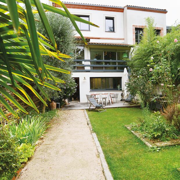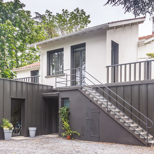 Bibliothèque sur-mesure autoportée. La structure en acier de la bibliothèque supporte des plateaux en BauBuche. Ce multiligne de hêtre permet de grandes portées, sans tuiler. Au pied de la bibliothèque, de grands tiroirs en medium sont peints en bleu très profond mat (référence Hague Blue de Farrow & Ball). Poignées en laiton modèle Closet