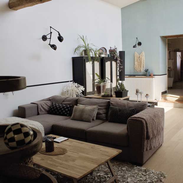 À Rouffiac, dans le Tarn, un jeune couple a décidé de retaper une vieille ferme. Première étape : la pièce à vivre. Avant. Tomettes, patine jaune et poutres noires dans le salon d’origine. Au fond, la porte ouvre sur la cuisine. Après. Peintures Farrow & Ball et parquet en chêne clair huilé.
