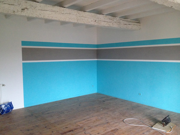 Dans le gîte : dortoir pour les enfants (4 lits). Charpente d’origine en peuplier décapée et vernie, parquet en frêne. Soubassement vert de gris, ligne rose orangé, balançoire suspendue.